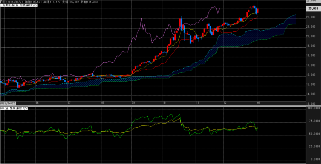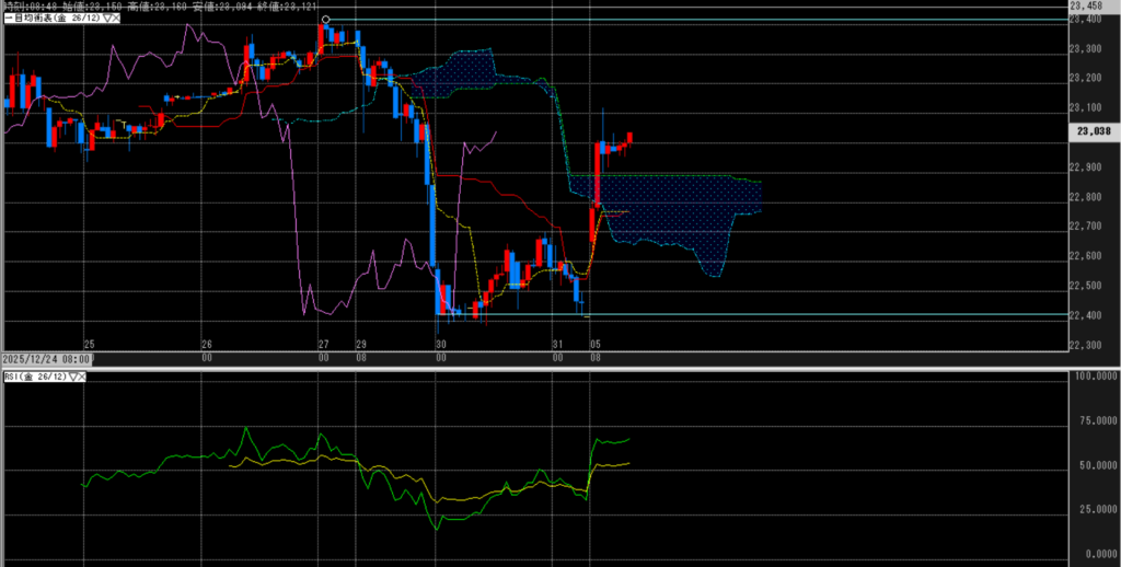 年末の大陰線から、年明けの大陽線でほぼ回収した状況。よって、三役好転も維持されている。RSIも特に異常は感じず。
