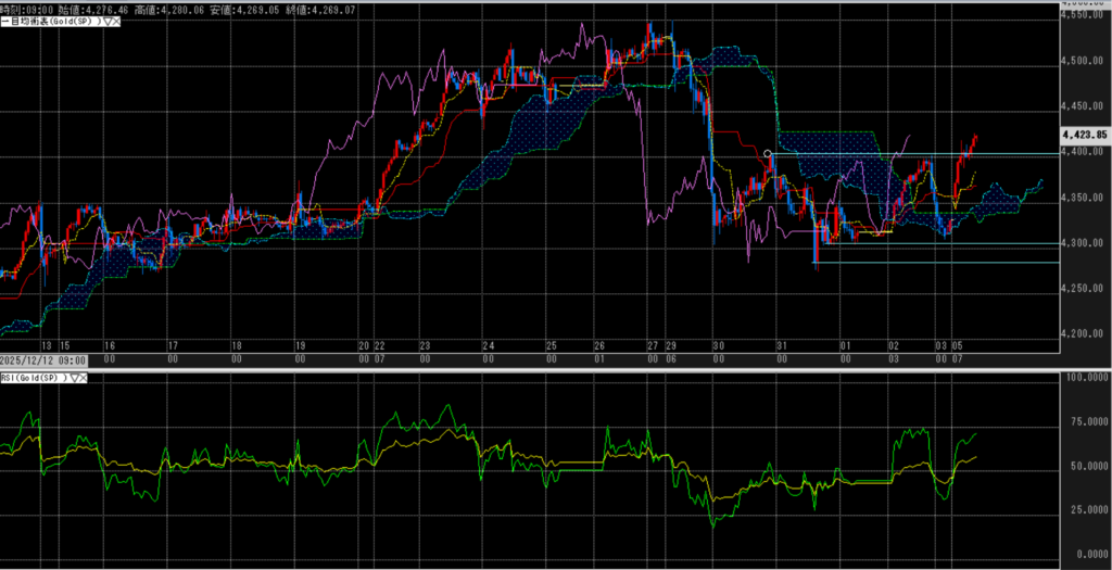 日足で見れば、12/29の大陰線は半分程度の回収にしか至っておらず、転換線に抑えられている様にも見える。時間足では4,400ドルをブレイク、三役好転としており、アップトレンドである。MA平均足も買い回転と言える。