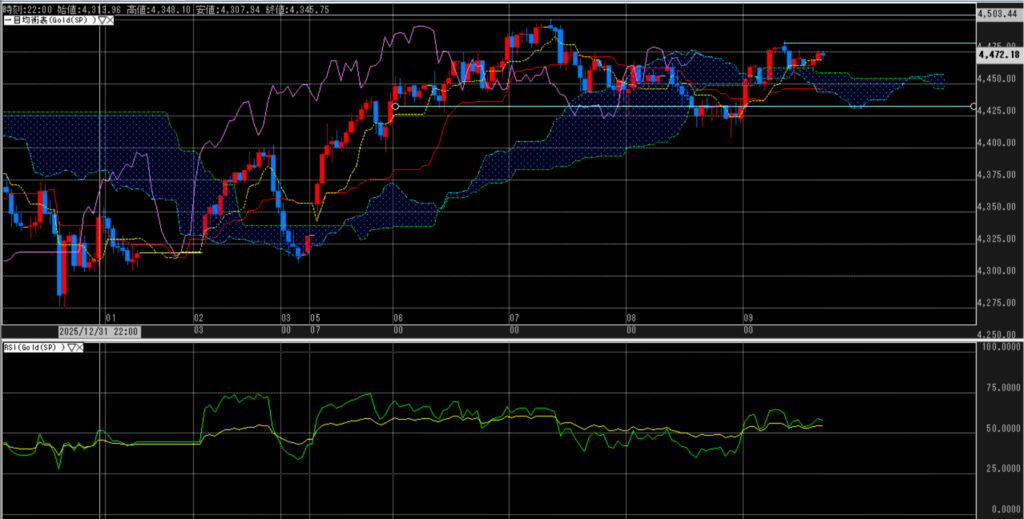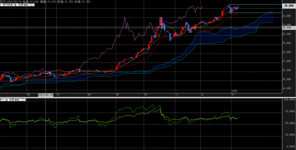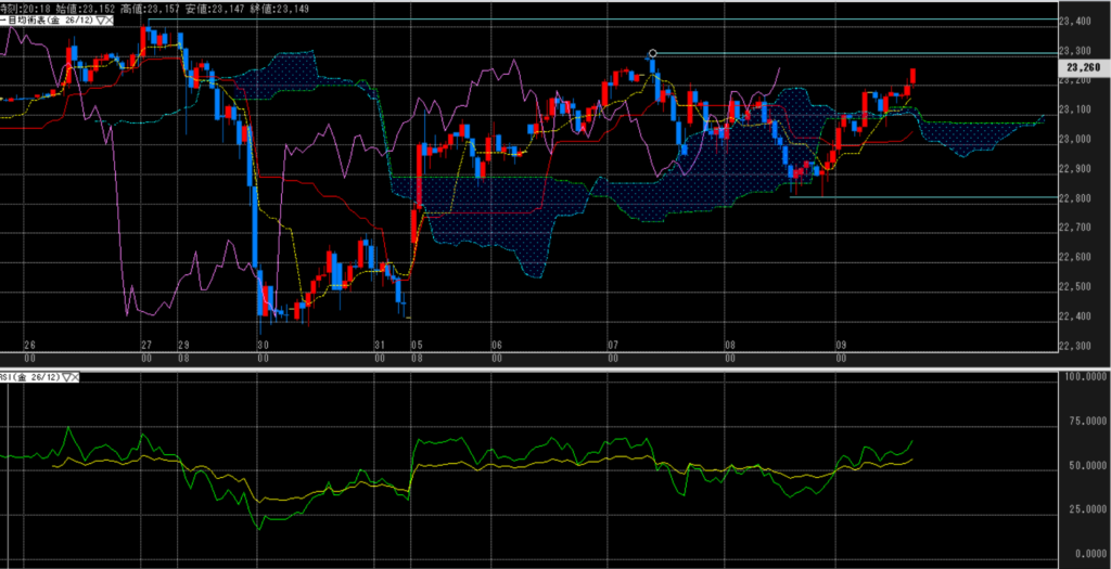 ドル建ては年末の大陰線は完全に回収し、強い上昇を見せる。転換・基準線との乖離が少し目立つも、RSIは行き過ぎとまでは行かない。