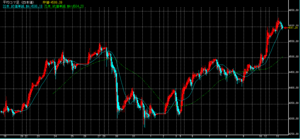 週明けの朝、4,540ドル~4,600ドルまでの大陽線以降は減速するも、大きく売られる気配は見えない。