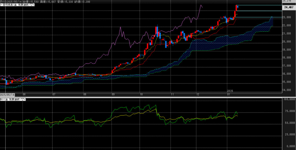 1/14時点では上昇トレンド自体は継続しているものの、日足は高値圏にあり過熱感が強かった。RSIの水準や値位置を踏まえると、短期的には利確売りが出やすく、終値から300〜400円程度の調整は十分想定内と判断。上にも下にも振れやすい局面だが、リスクは上値追いより下押し側にある。