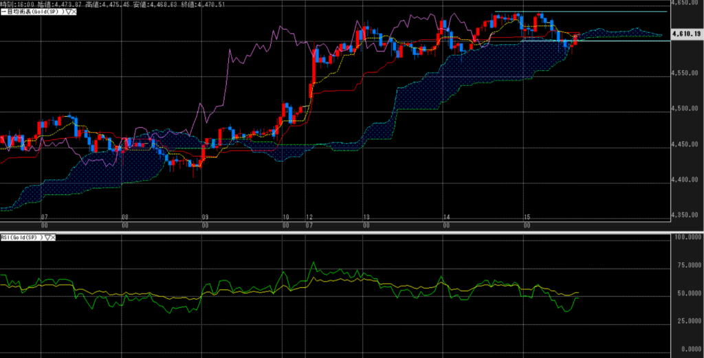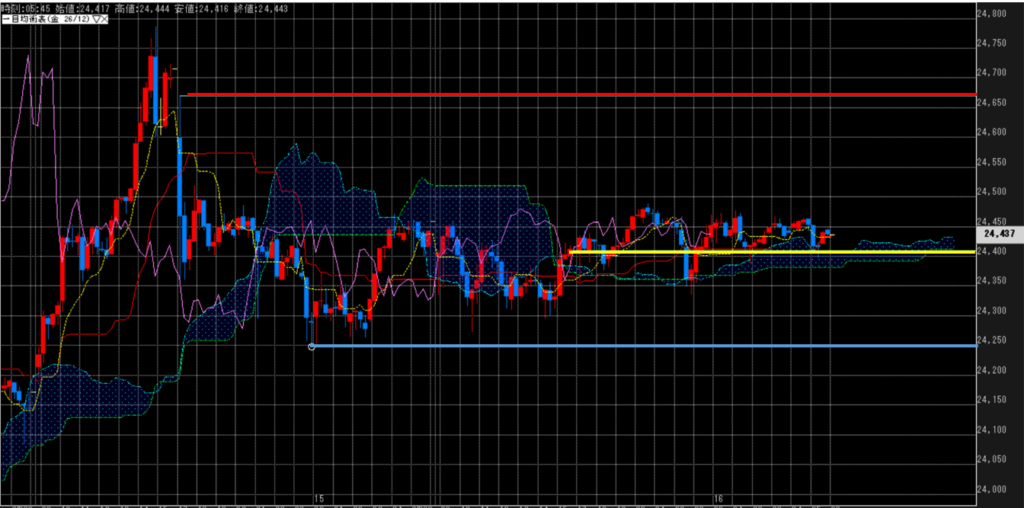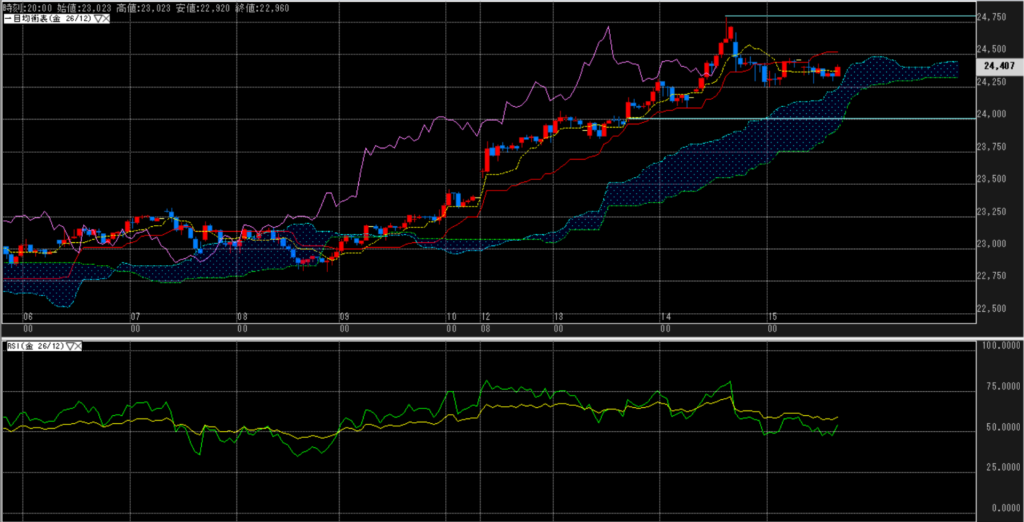予測通りの弱含みの展開。転換・基準線は逆転し、遅行線は実体とぶつかる態勢であるが、方向は容易に変えられる値位置である。