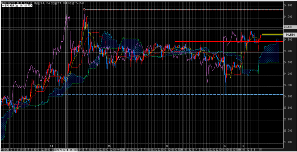 赤点線:レジスタンス赤線:前日高値黄線:前日終値青点線:サポートライン