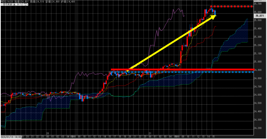 赤点線:目先レジスタンス、赤線:前日高値、黄線:始値~以降の推移、青点線:目先サポートライン