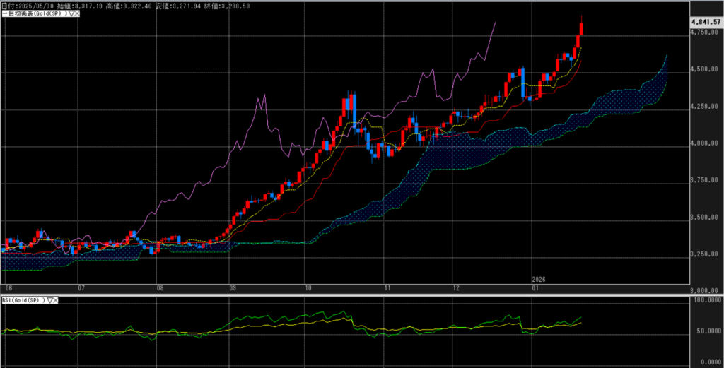 金価格はドル建て現物で史上最高値を更新し、4800ドル台に乗せた。トランプ大統領がグリーンランド領有に強い姿勢を示し、欧州との対立が先鋭化する中、地政学リスクへの警戒感が安全資産需要を押し上げた。加えて、米欧対立を背景としたドル安基調も金価格を支援している。アジア時間には一時的な押しも見られたが、押し目では買いが入り、高値圏での推移が続いた。市場では、欧州連合による対抗措置協議や、ダボス会議での発言内容が意識される中、金はリスク回避局面の受け皿として注目を集めている。