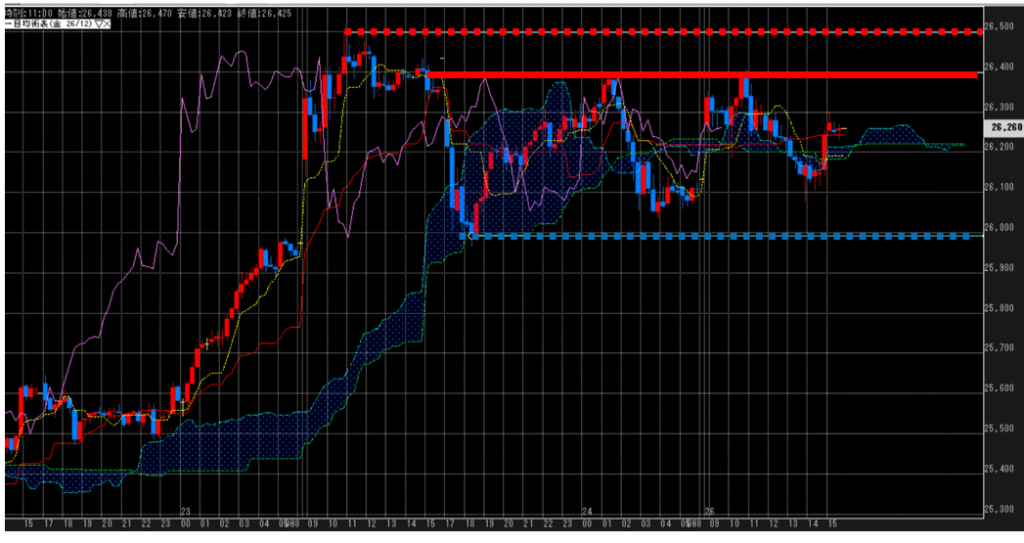 前日高値~目先レジスタンスを往復する動き。概ね、26,000円~26,400円がレンジと考えられる。