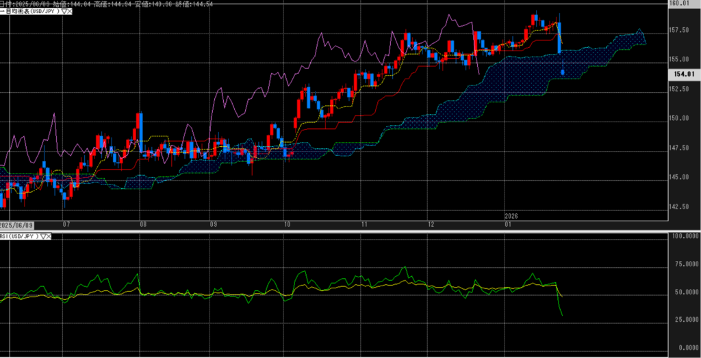 USD/JPY日足は週末の大陰線から、さらに雲の中に突入、下降雲への捻じれを見せている。