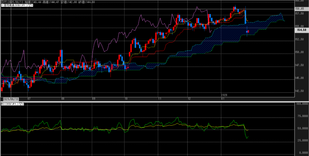 一方、USD/JPY(下段)は雲の中で留まっており、一服と言う気がしないでない。とは言え、週末の大陰線が強烈すぎる。