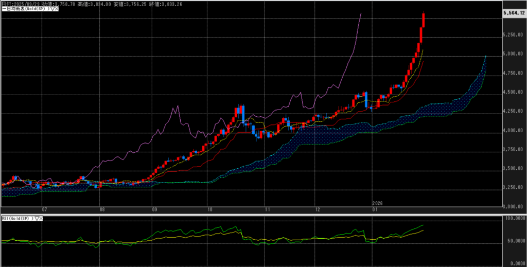 金は明確に主役級の強さを維持。ドル安基調に加え、米政治リスク、政府機関閉鎖懸念、FRB独立性への警戒、さらにイラン情勢といった地政学リスクが重なり、安全資産としての需要が急拡大している。5000ドル台到達後も調整は限定的で、5500ドルを試す動きが続くなど、需給の強さが際立つ。一方で短期的には過熱感も否定できず、急伸後は値幅調整が入りやすい。ただし押し目では買いが入りやすく、「リスクが消えない限り金は下がりにくい」という構図が当面続くと見られる。
