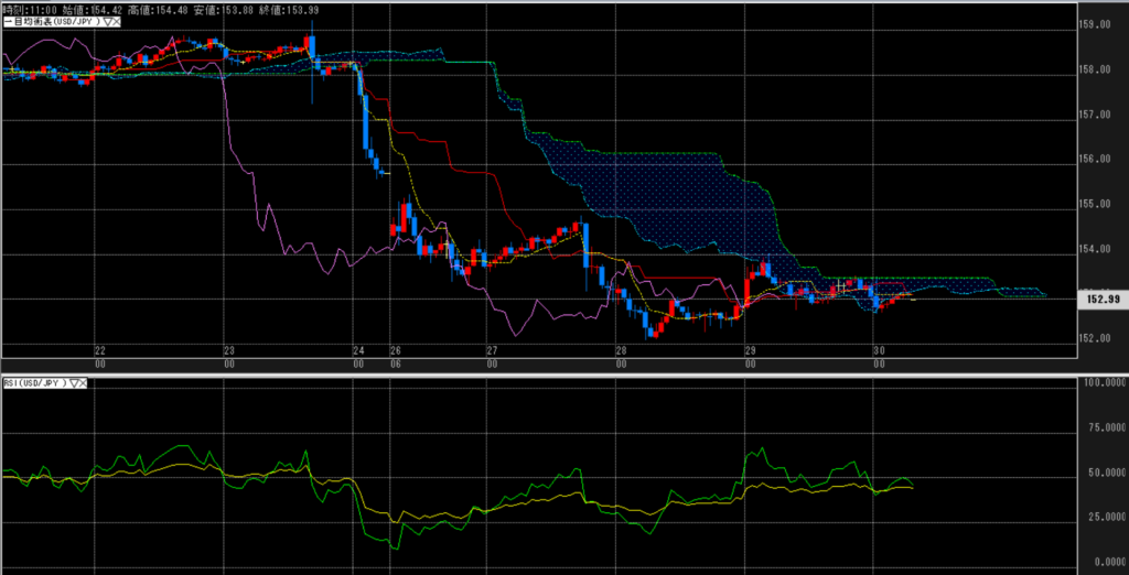 ドル建て(上段)は想定通りの調整売りと思われる動きがあり、雲を完全に下抜けることなく戻す。遅行線の値位置から、大陰線を東京タイムの中で回収するのか、戻り売りになるのかは判断が難しい。