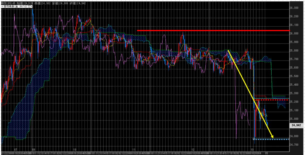 25,600円からのブレイク、一気にレンジが移動。引き続き、下方ブレイクの可能性を警戒せざるを得ない。