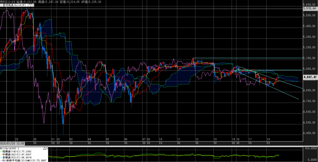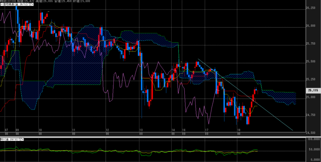 日足は特大陰線2発の中で、上値を下げている。時間足は、一旦はダウントレンドからは外れて、雲への突入を試す展開。