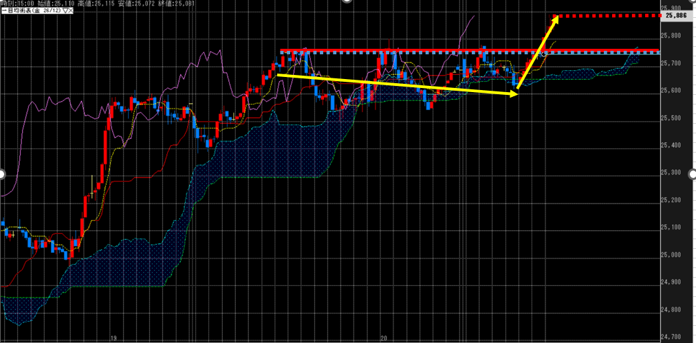 | 時間足 | レンジ:25,630円~26,250円 下限は水曜日のNYタイム寄付きの陽線の終値、さらにレンジを押し上げていると考える。とは言え、レジスタンスも細かく意識される様に見える。 |
