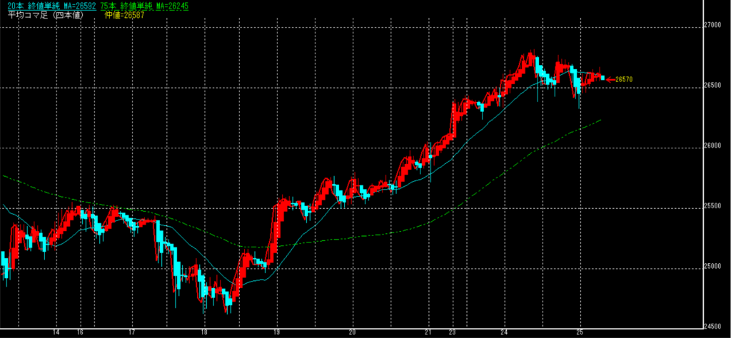 高値を付けた後の下落、各線が弱くなる中、雲が機能するかの瀬戸際。MA平均足で見る限り、押してからの再上昇と見られ、十分に期待できる。