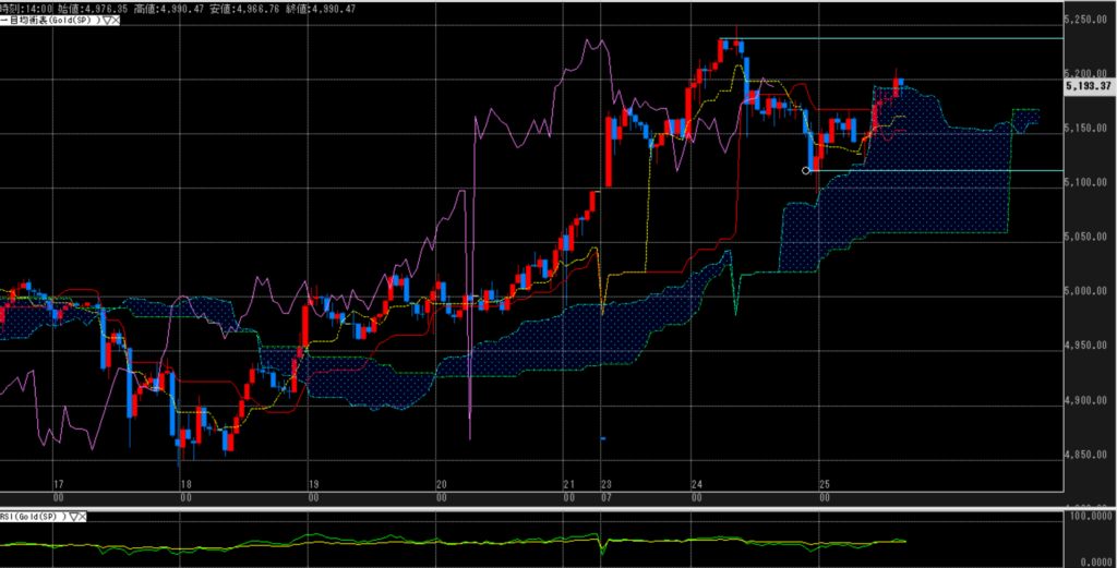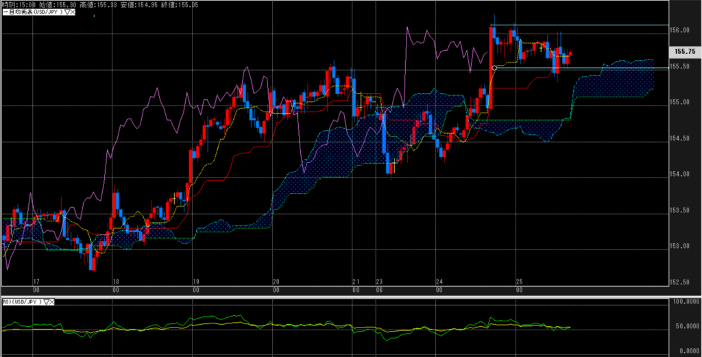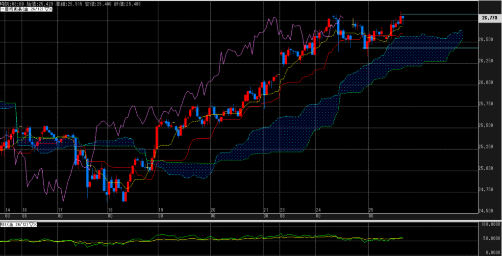 日足では、週初の高値が明らかなレジになっているが、時間足で見れば、雲は厚くサポートされている。