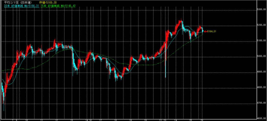 各方面から底堅く思われ、アップトレンドは継続されると想定する。但し、もう一段引き上げるエネルギーは感じ辛い。