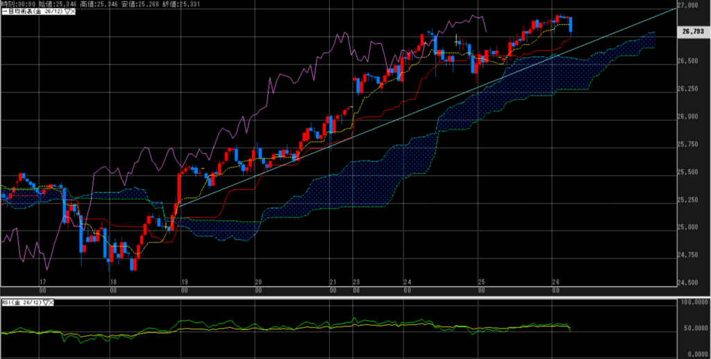 デイトレード予測<2026/12月限、15分足> かなり狭い、レジサポになってしまった。転換線の下に入るも弱さはなく、押し目と考え、レジを突き抜ける展開を期待する。レジ:…