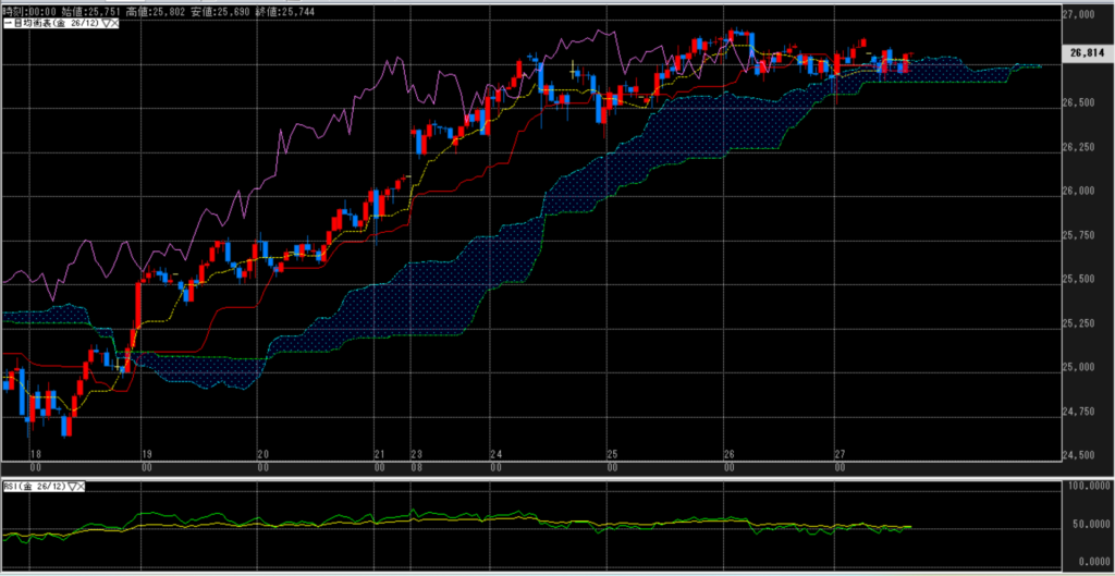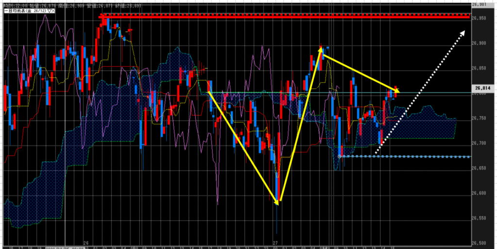 ファンダメンタルズ的は利確までの要因であり、積極的に売るポジションを作るまでの内容では無いと思われる。とは言え、値ごろ的には27,000円がかなり重いと思われ、強く終わる可能性はかなり低いと想定。
