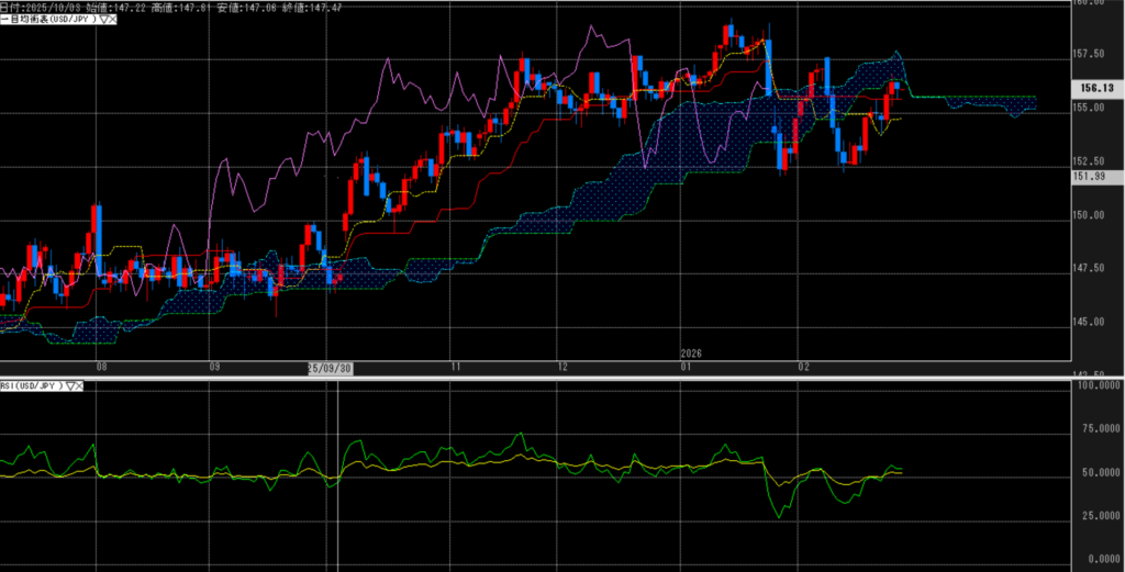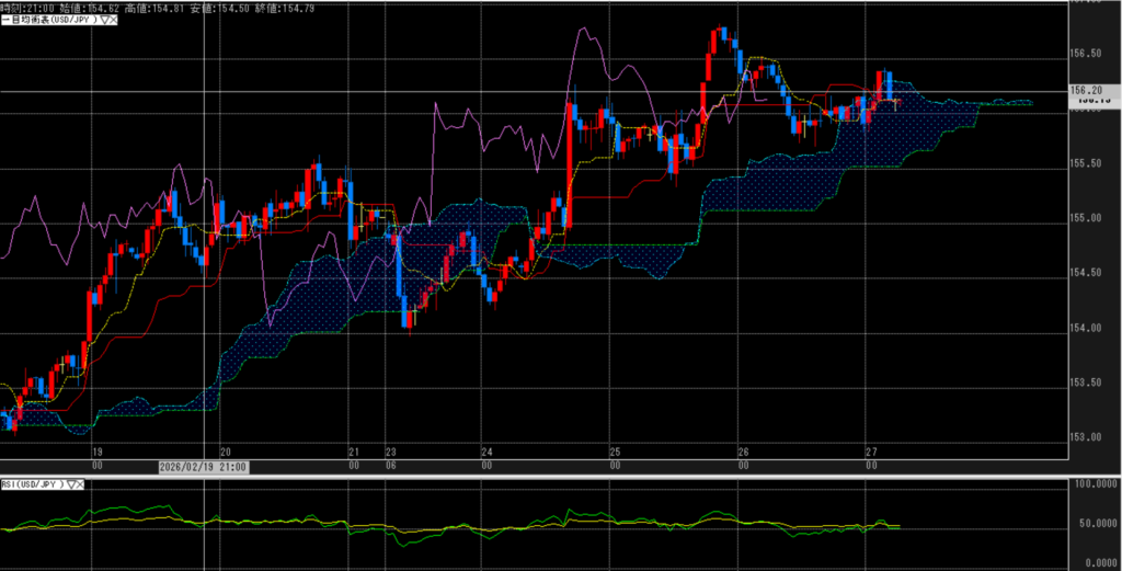 日足~時間足:日足では、雲を抜けきらずいるが、時間足では雲に支えられている展開で結果的に狭いレンジでの推移。