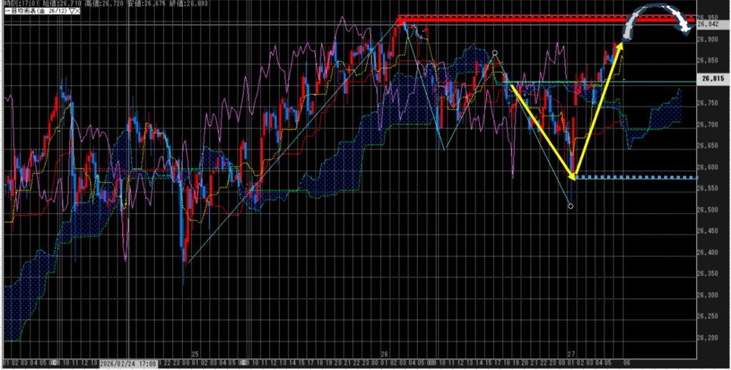 ファンダメンタルズ的は利確までの要因であり、積極的に売るポジションを作るまでの内容では無いと思われる。値ごろ的には27,000円がかなり重いと思われ、強く終わる可能性はかなり低いと想定。