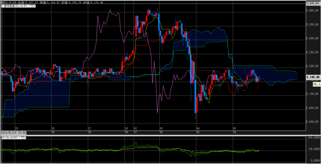 SPOTの下げ幅も限定的にも見えるが、遅行線は実体を上抜く強さまでは感じず。一方でUSD/JPYは完全な三役暗転が見えてきており、下落幅を拡大させる動きが懸念される。