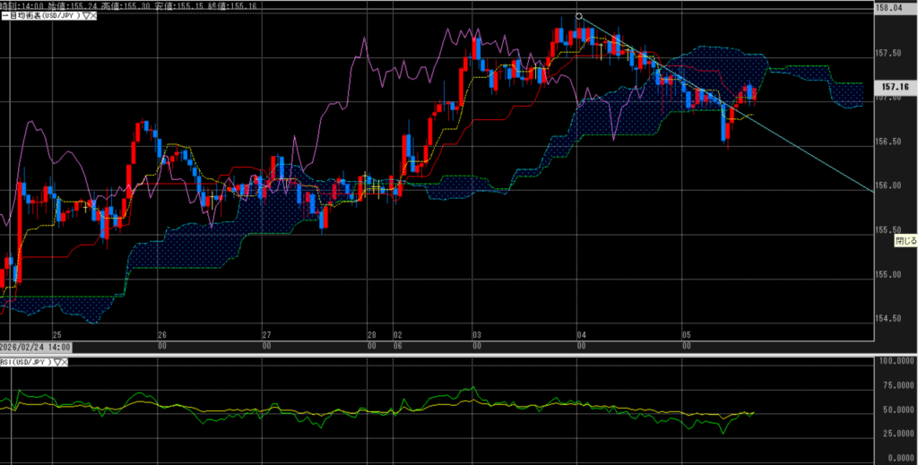 USD/JPYもダウントレンドからは外れている様にも見えるも、下降雲を抜けるまでの強さはない。