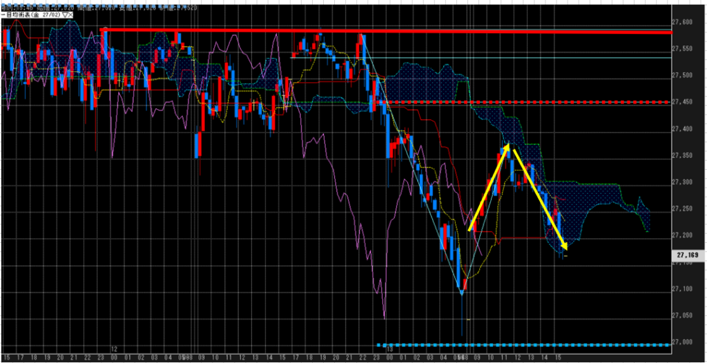 寄付きは27,500円超から始まるも、欧州タイム終了前に弱含み、下落。東京タイムの午前中では、戻す動きを見せるも、トレンドが変わるまでの動きはなし。むしろ、戻り売りの様相。
