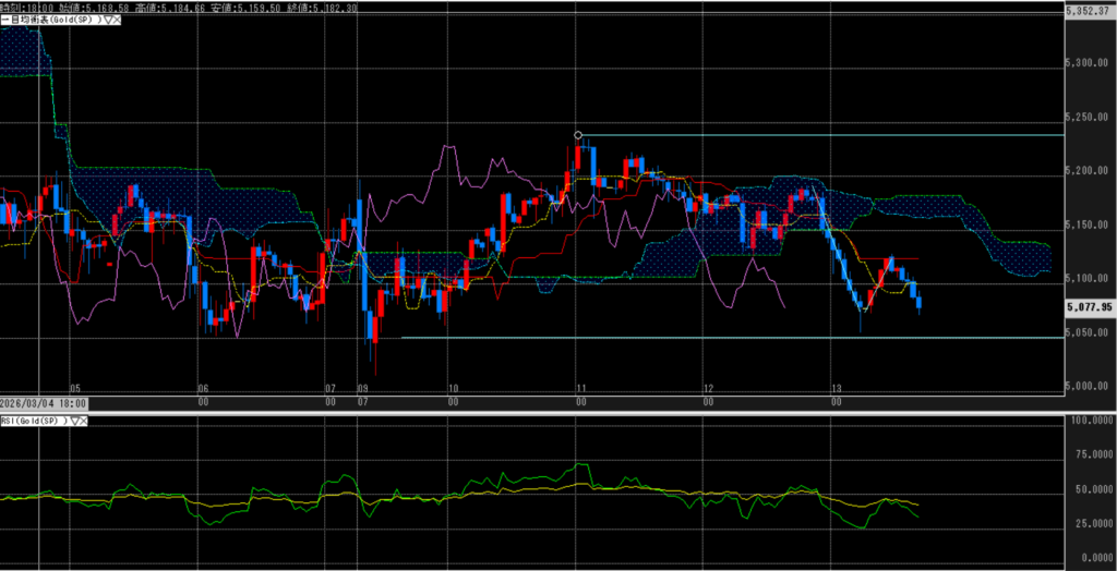 金は基調として安全資産需要に支えられやすいが、短期的にはドル高や金利上昇で上値が抑えられやすい。そのため下げる場面があっても、金そのものが弱いというより、株の損失補填や換金売りが出やすい局面とみるのが自然である。全体としては、来週も中東情勢と原油動向がドル円・株・金の方向を左右しやすい。