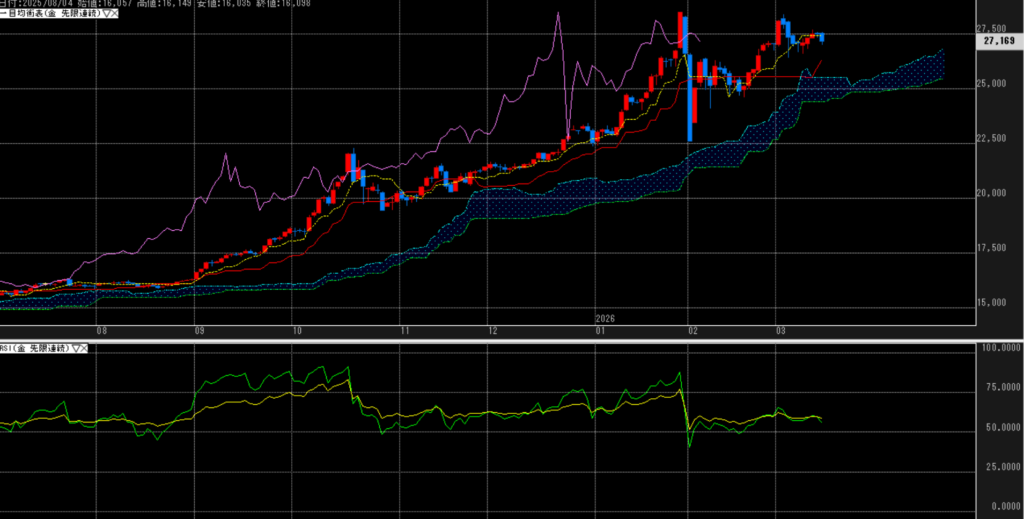 しかし、板の薄い中での出来事と思われ、27,000円の値ごろをさらに売り進む可能性が否めない。