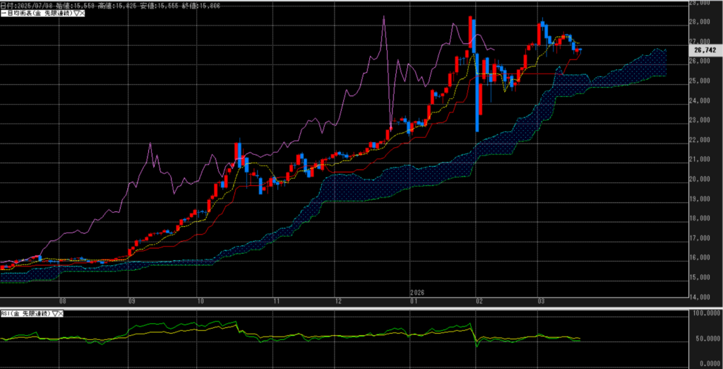 円建て金は東京タイム寄付き前の段階で上値の重さが意識されやすく、当面はドル建て金とUSD/JPY、さらに上位足の流れを丁寧に確認しながら、戻りの強さと下値の固さを見極める局面が続きそうである。