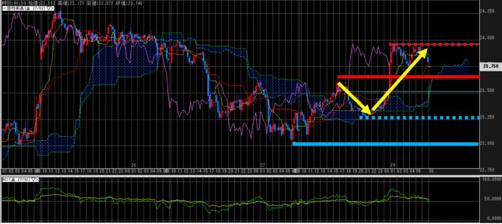 前日高値を上抜ける動きを見せるも、24,000円で跳ね返されており、上位足に従い、強い流れとは言えない。