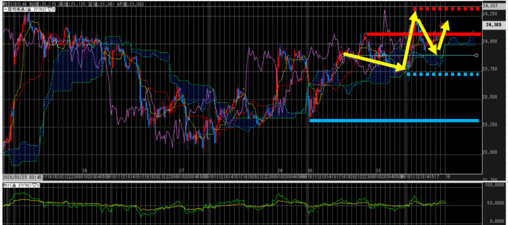 下値は23,750円だが、ブレイクするならば、500円程度を期待することができる。